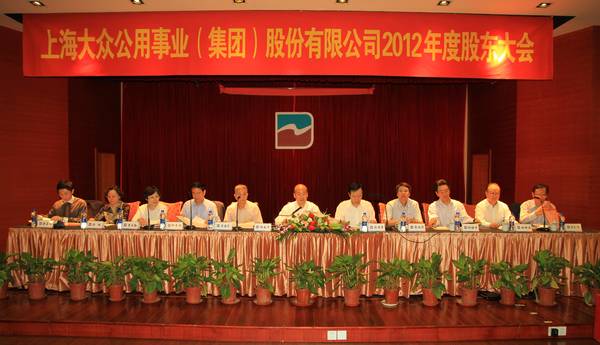 上海大眾公用事業(yè)(集團)股份有限公司2012年度股東大會于2013年6月6日上午在上海市中山西路1525號技貿(mào)賓館三樓多功能廳召開,出席本次會議的股東及股東委托代理人共69人,代表股份474,587,709(四億七千四百五十八萬七千七百零九)股,占公司總股本的28.8526%。符合《公司法》及《公司章程》的規(guī)定。