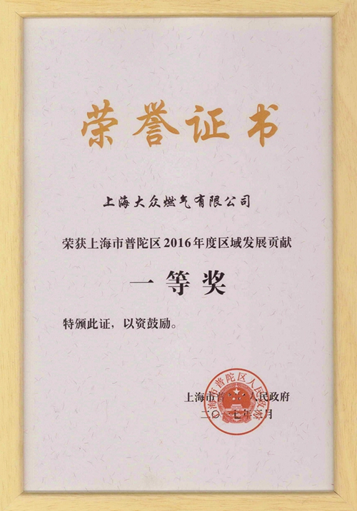 2017年3月9日,上海普陀區(qū)政府組織召開(kāi)了普陀區(qū)投資促進(jìn)工作先進(jìn)表彰大會(huì),對(duì)2016年度區(qū)域發(fā)展貢獻(xiàn)重點(diǎn)企業(yè)進(jìn)行了表彰,上海大眾燃?xì)庥邢薰精@得區(qū)域發(fā)展貢獻(xiàn)一等獎(jiǎng)榮譽(yù)。