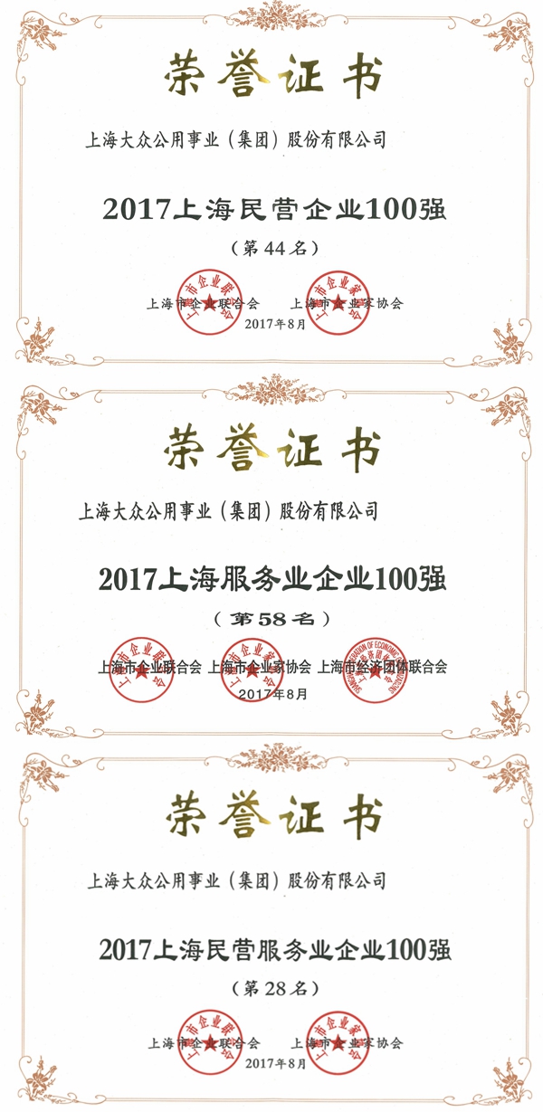 大眾公用榮膺2017上海民營(yíng)企業(yè)百?gòu)?qiáng)等榮譽(yù)稱(chēng)號(hào)