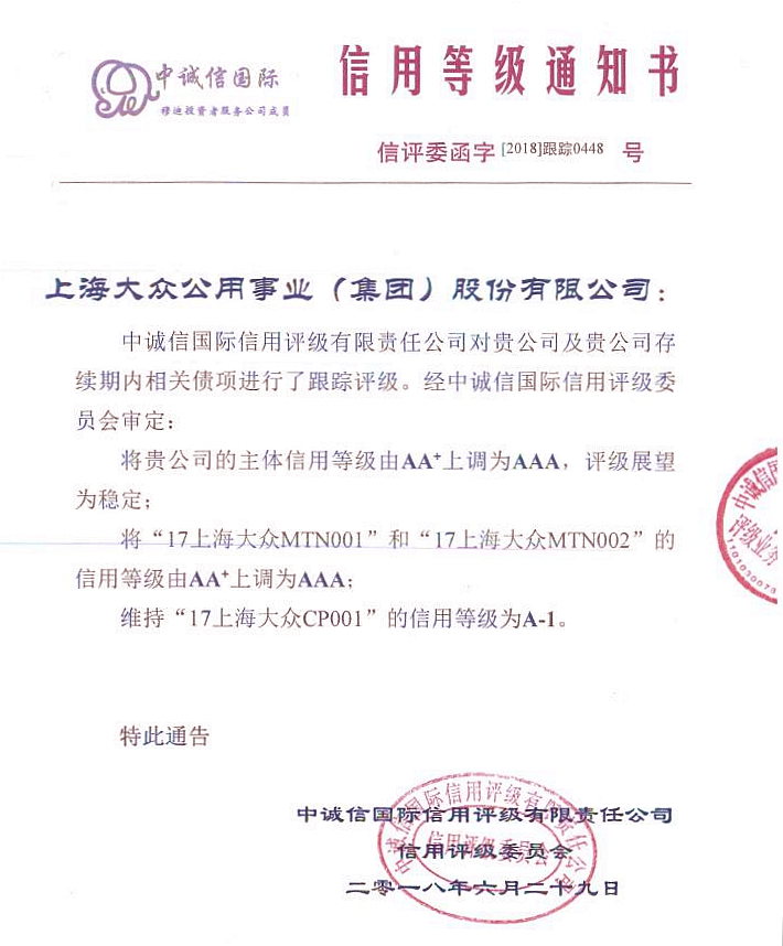 將集團的主體信用等級由AA+上調為AAA,評級展望為穩(wěn)定;將 “17上海大眾MTN001”和“17上海大眾MTN002”信用等級由AA+上調為AAA。