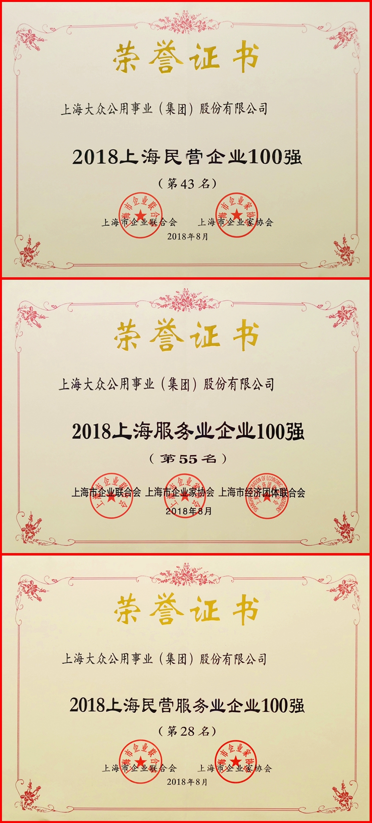 大眾公用榮列“2018上海服務(wù)業(yè)企業(yè)100強(qiáng)”第55名,“2018上海民營(yíng)企業(yè)100強(qiáng)”第43名,“2018上海民營(yíng)服務(wù)業(yè)企業(yè)100強(qiáng)”第28名。