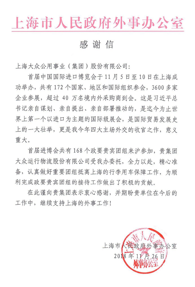 上海市人民政府外事辦公室致大眾公用集團感謝信