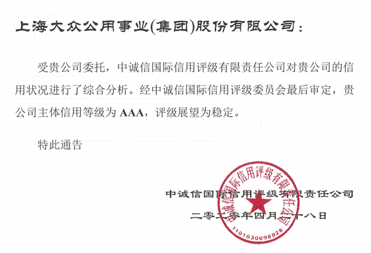 大眾公用2020年主體信用評級報(bào)告出爐