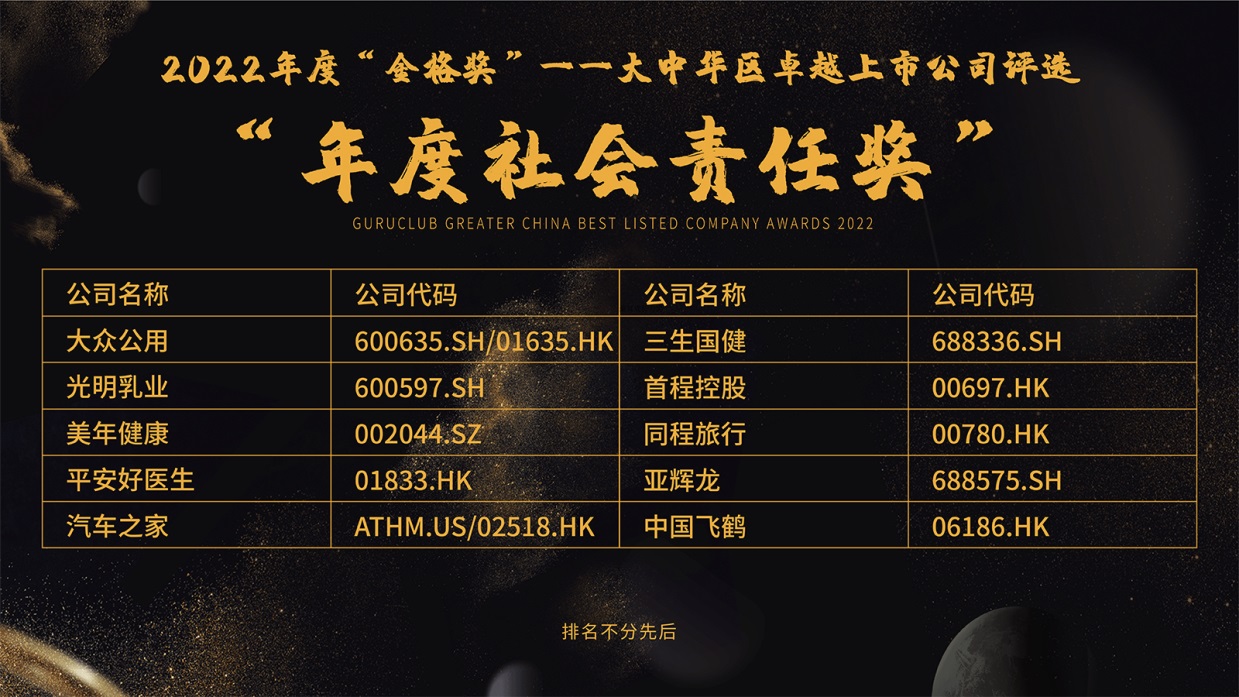 第七屆“格隆匯•全球投資嘉年華•2023”于12月15日一22日在線上盛大舉行。在本年度格隆匯“金格獎(jiǎng)”--大中華區(qū)卓越上市公司評(píng)選2022年度中,大眾公用(600635.SH/1635.HK)榮獲“年度社會(huì)責(zé)任獎(jiǎng)”獎(jiǎng)項(xiàng)。