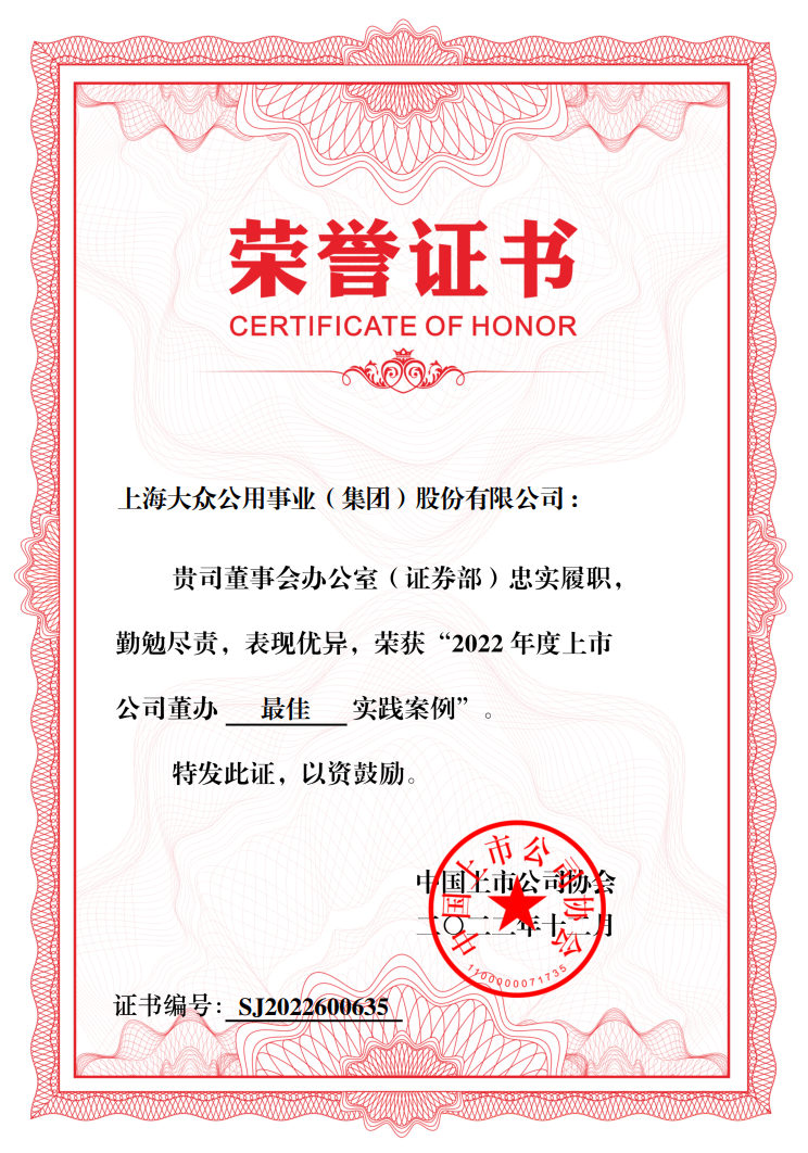 “2022上市公司董辦最佳實踐”評選結(jié)果于12月16日揭曉。大眾公用榮獲“2022上市公司董辦最佳實踐”獎。