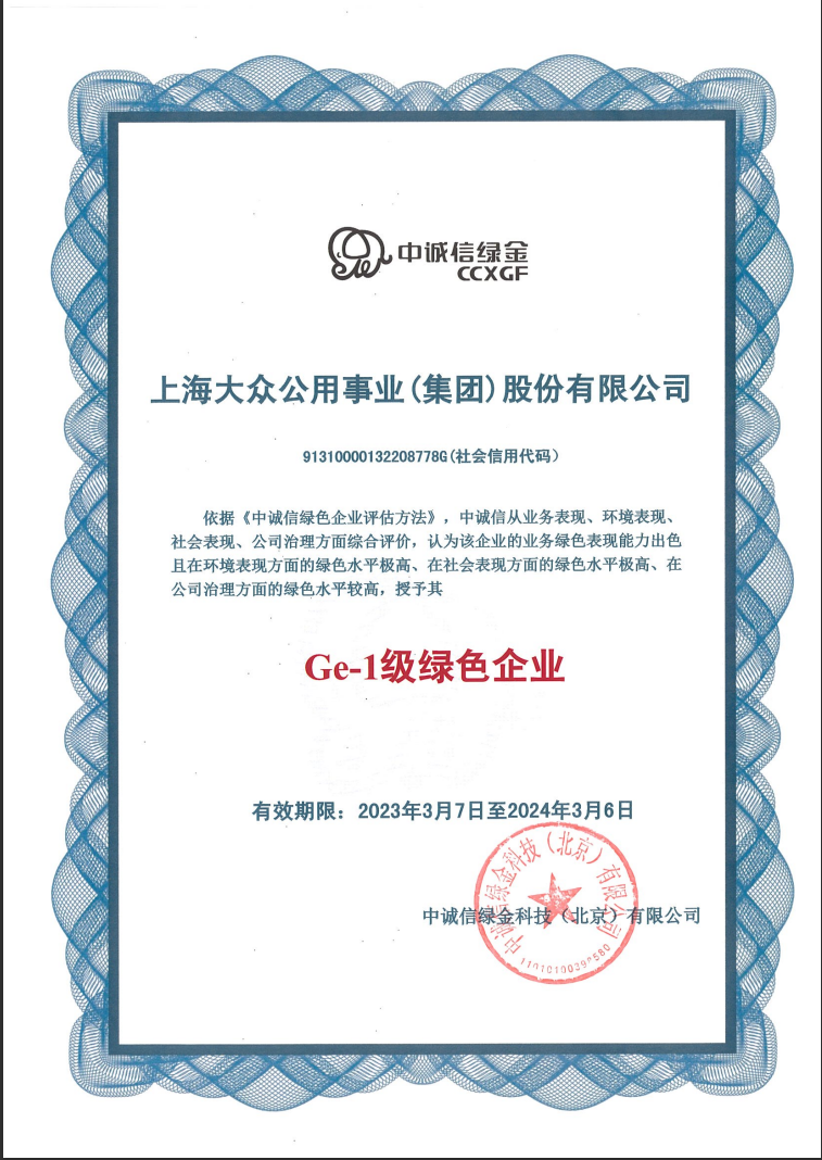 2023年3月7日,國內(nèi)綠色金融領(lǐng)域第三方評估機構(gòu)中誠信綠金科技(北京)有限公司根據(jù)中國銀行保險監(jiān)督管理委員會發(fā)布的《綠色融資統(tǒng)計制度》、國家發(fā)展和改革委員會等七部委發(fā)布的《綠色產(chǎn)業(yè)指導目錄(2019年版)》、中國人民銀行等三部委發(fā)布的《綠色債券支持項目目錄(2021年版)》以及中誠信發(fā)布的《中誠信綠色企業(yè)評估方法》和其他相關(guān)標準進行綠色企業(yè)評估,再次授予上海大眾公用事業(yè)(集團)股份有限公司綠色企業(yè)最高等級“Ge-1級”。