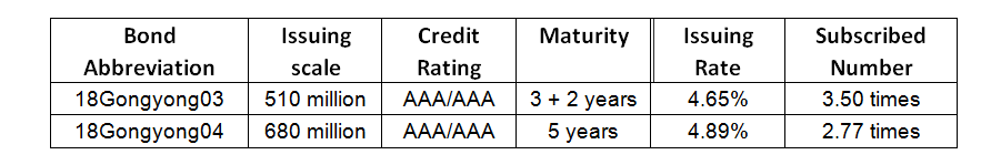 The final price of the first issue in March 2018 was 5.58%, ranking the first place among other AA+ companies and the top five among AAA companies. The timing of the issue was accurately measured, and the price of 3+2 year varieties was lower than the benchmark interest rate of the central bank in the same period after the adjustment.