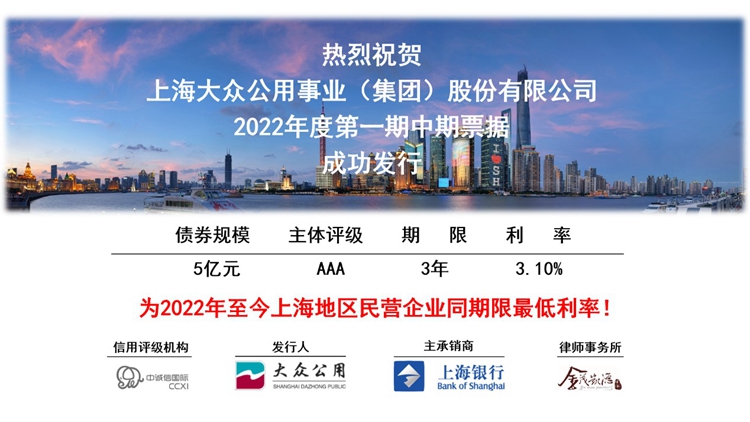 大眾公用2022年度第一期中期票據(jù)于2022年5月9日成功公開(kāi)發(fā)行,本期中期票據(jù)發(fā)行規(guī)模5億元,期限3年,主體評(píng)級(jí)AAA,經(jīng)發(fā)行人和主承銷商上海銀行共同努力,最終確定本期債券票面利率為3.1%,創(chuàng)大眾公用同期限發(fā)行債券價(jià)格歷史新低,此次債券的發(fā)行也得到了廣大投資者的積極響應(yīng)。特別在上海疫情肆虐的期間,公司和合作機(jī)構(gòu)克服了對(duì)抗病毒和被封閉的重重困難,圓滿完成中票的發(fā)行工作。在此大眾公用感謝上海銀行對(duì)此次中票成功發(fā)行所做出的貢獻(xiàn),同時(shí)也感謝其他各參與發(fā)行工作的相關(guān)機(jī)構(gòu)對(duì)大眾公用的支持與幫助!