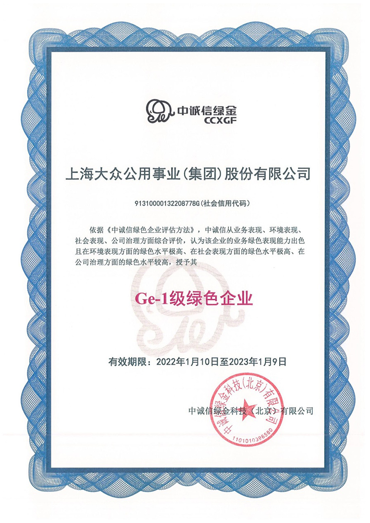 2022年1月13日,國內(nèi)綠色金融領(lǐng)域第三方評估機(jī)構(gòu)中誠信綠金科技(北京)有限公司根據(jù)中國銀行保險監(jiān)督管理委員會發(fā)布的《綠色融資統(tǒng)計制度》、國家發(fā)展和改革委員會等七部委發(fā)布的《綠色產(chǎn)業(yè)指導(dǎo)目錄(2019年版)》、中國人民銀行等三部委發(fā)布的《綠色債券支持項目目錄(2021年版)》以及中誠信發(fā)布的《中誠信綠色企業(yè)評估方法》和其他相關(guān)標(biāo)準(zhǔn)進(jìn)行綠色企業(yè)評估,授予上海大眾公用事業(yè)(集團(tuán))股份有限公司Ge-1級綠色企業(yè)等級。