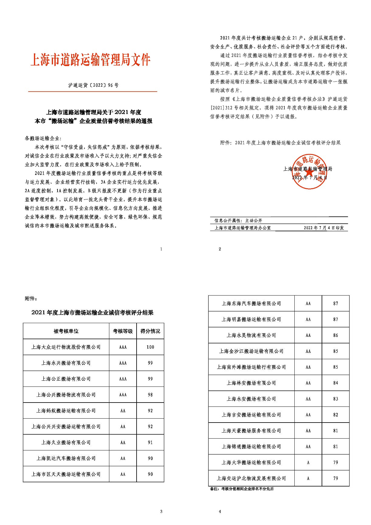 7月4日,上海大眾運行物流股份有限公司榮獲2021年度上海市“搬場運輸”企業(yè)質(zhì)量信譽考核最高評級---AAA評級,并且是獲得AAA評級的唯一一個滿分企業(yè),充分展現(xiàn)了行業(yè)主管部門、權(quán)威評審機構(gòu)對大眾物流品牌信譽和企業(yè)實力的高度認(rèn)可。