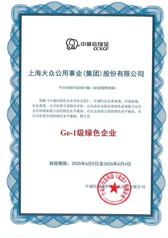 大眾公用連續(xù)四年獲評(píng)綠色企業(yè)評(píng)級(jí)最高等級(jí)Ge-1級(jí)