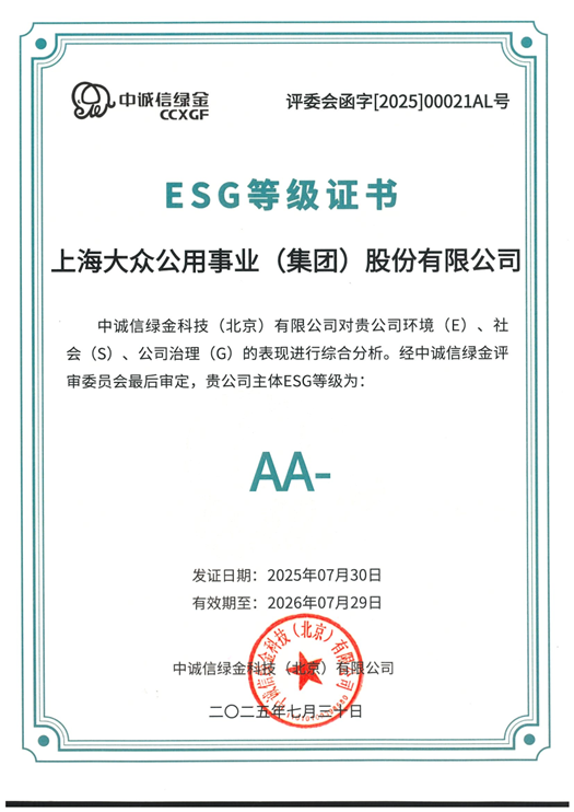 近日,憑借在環(huán)境、社會及公司治理(ESG)領(lǐng)域的卓越表現(xiàn),大眾公用2025年ESG評級由A+上調(diào)至AA-。此次獲評AA-等級,不僅反映公司在ESG領(lǐng)域的持續(xù)投入和高水平實踐,也彰顯公司在綠色發(fā)展、社會責(zé)任以及公司治理等方面的系統(tǒng)成效和行業(yè)領(lǐng)先水平。