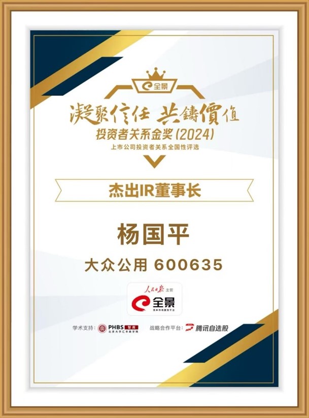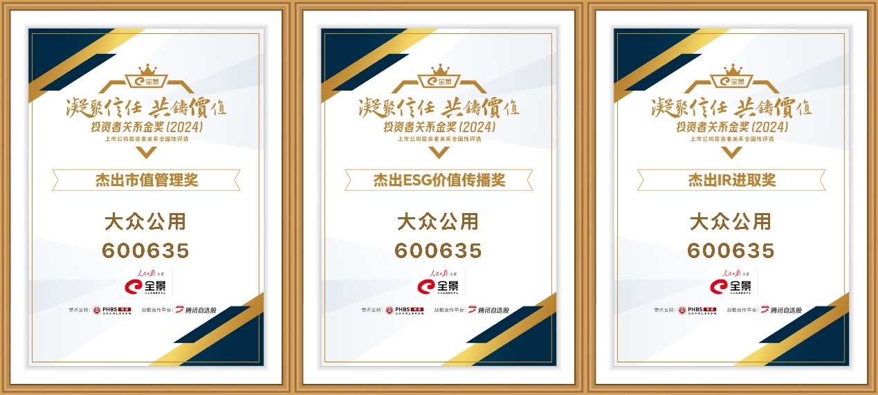 近日,由深耕投資者關(guān)系領(lǐng)域逾20年的全景網(wǎng)主辦的“全景投資者關(guān)系金獎(jiǎng)”2024年度全國(guó)性評(píng)選,經(jīng)過專家顧問組最后環(huán)節(jié)的評(píng)審,獲獎(jiǎng)榜單正式揭曉。大眾公用憑借卓越的投資者關(guān)系管理實(shí)踐,一舉奪得“杰出IR董事長(zhǎng)獎(jiǎng)”、“杰出市值管理獎(jiǎng)”、“杰出IR進(jìn)取獎(jiǎng)”、“杰出ESG價(jià)值傳播獎(jiǎng)”共計(jì)四項(xiàng)大獎(jiǎng)。